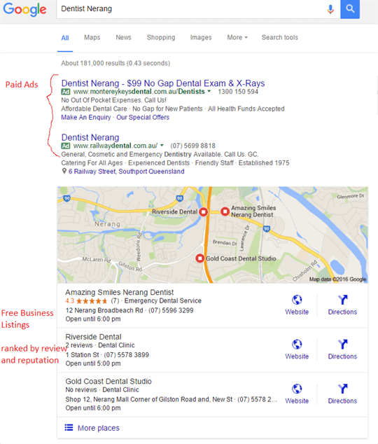 As an example here is the search result for; Dentist Nerang